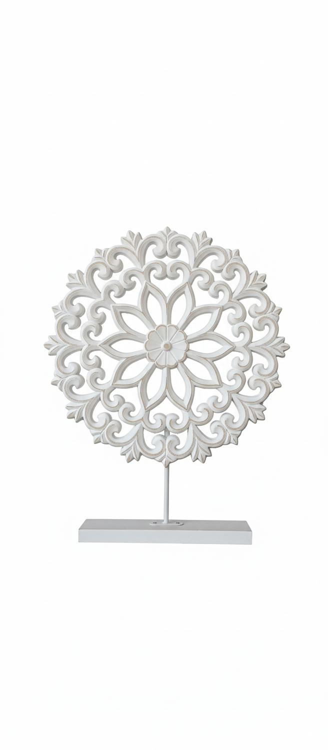 Adorno decorativo Mandála Redondo Blanco, elaborado en melamina de alta calidad y montado sobre pedestal firme.