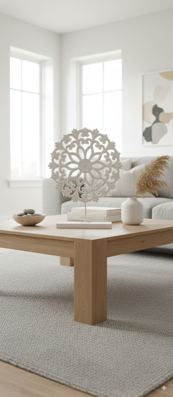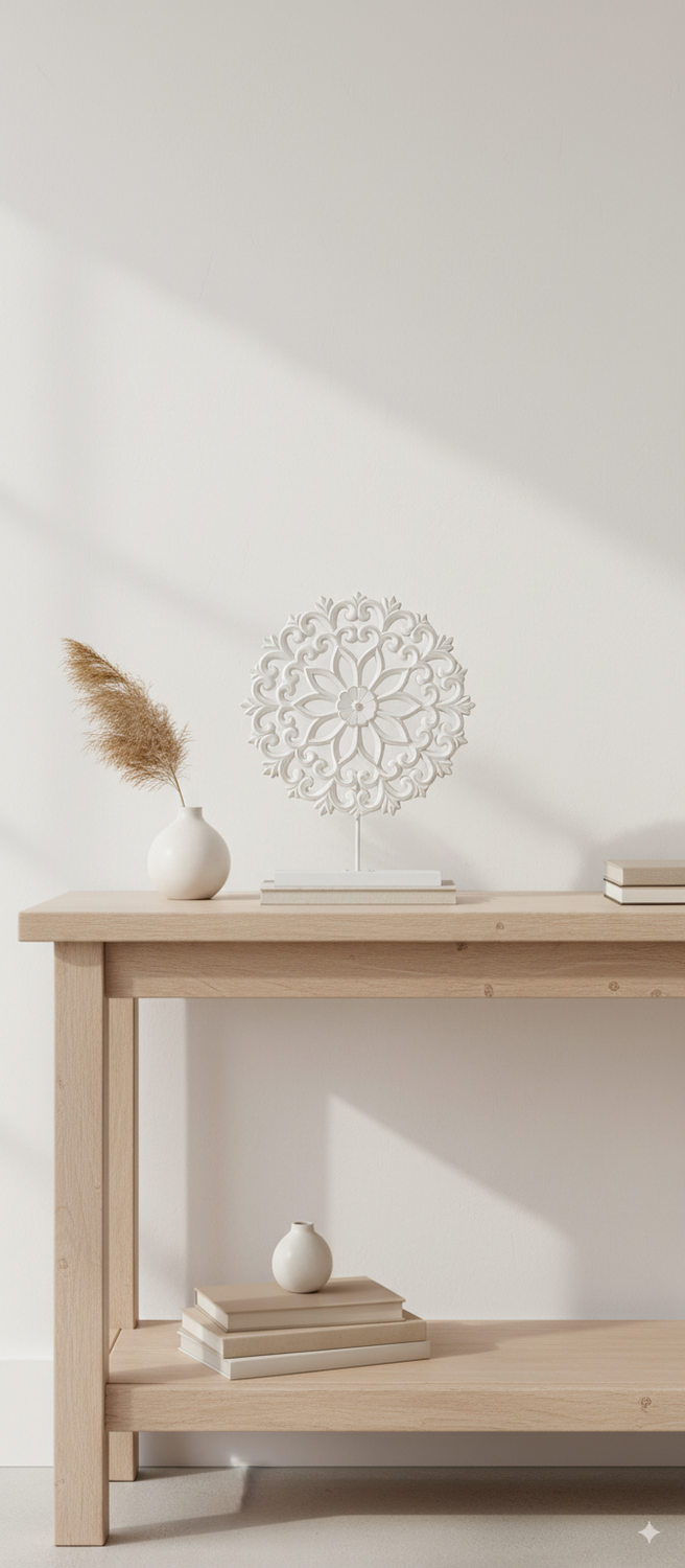 El mandala es un símbolo ancestral de unidad, equilibrio y espiritualidad. El color blanco refuerza la pureza y la calma, aportando serenidad a los espacios. Su pedestal otorga presencia y elegancia, ideal para resaltar en mesas, repisas o entradas.