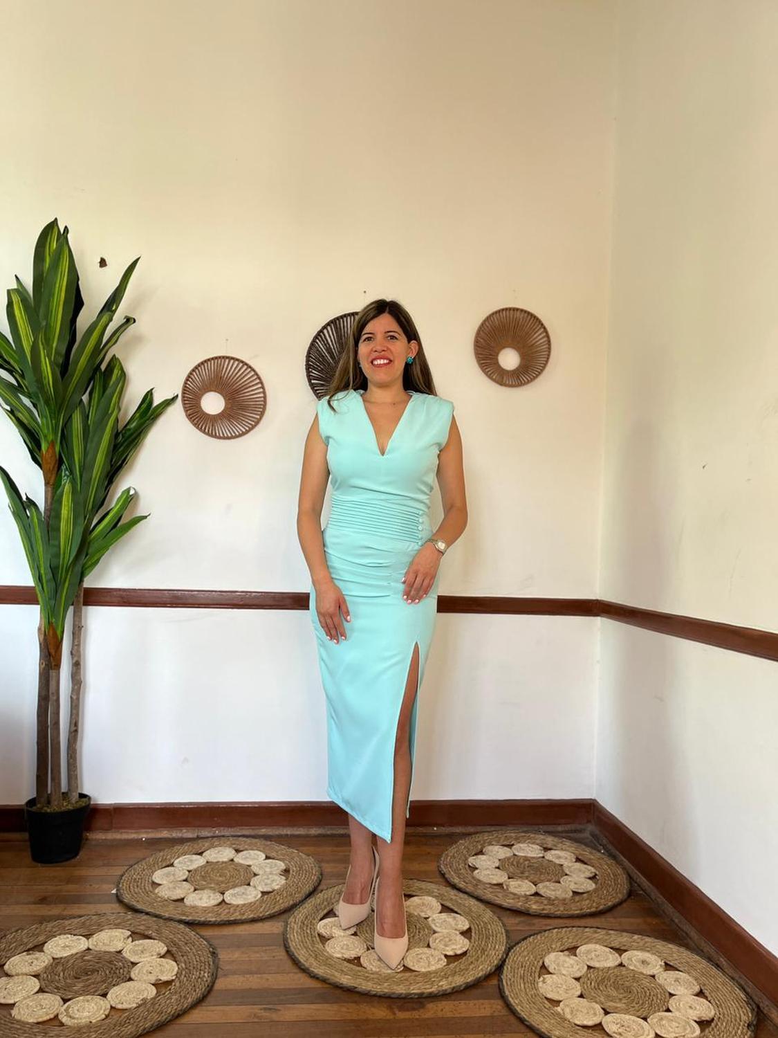 Vestido para ocasiones especiales fabricado en España de color verde menta, sin mangas, tela con un 5% elastano el cual se puede utilizar una talla más o una talla menos según tu preferencia de calza, ideal para invitada de boda, madrina de dama de honor, u otra ocasión especial. Vestido con forro, largo, tajo sobre la rodilla, drapeado en la cintura con detalle de botones forrado, cuello en V, con hombreras, Cierre en la espalda, sin bolsillos.Esta en colores Verde, Rojo y Verde menta, importado exclusivamente desde España a Chile por Integranegociospa para Divinopecadostore. Vestido Midi Frunces Verde Menta