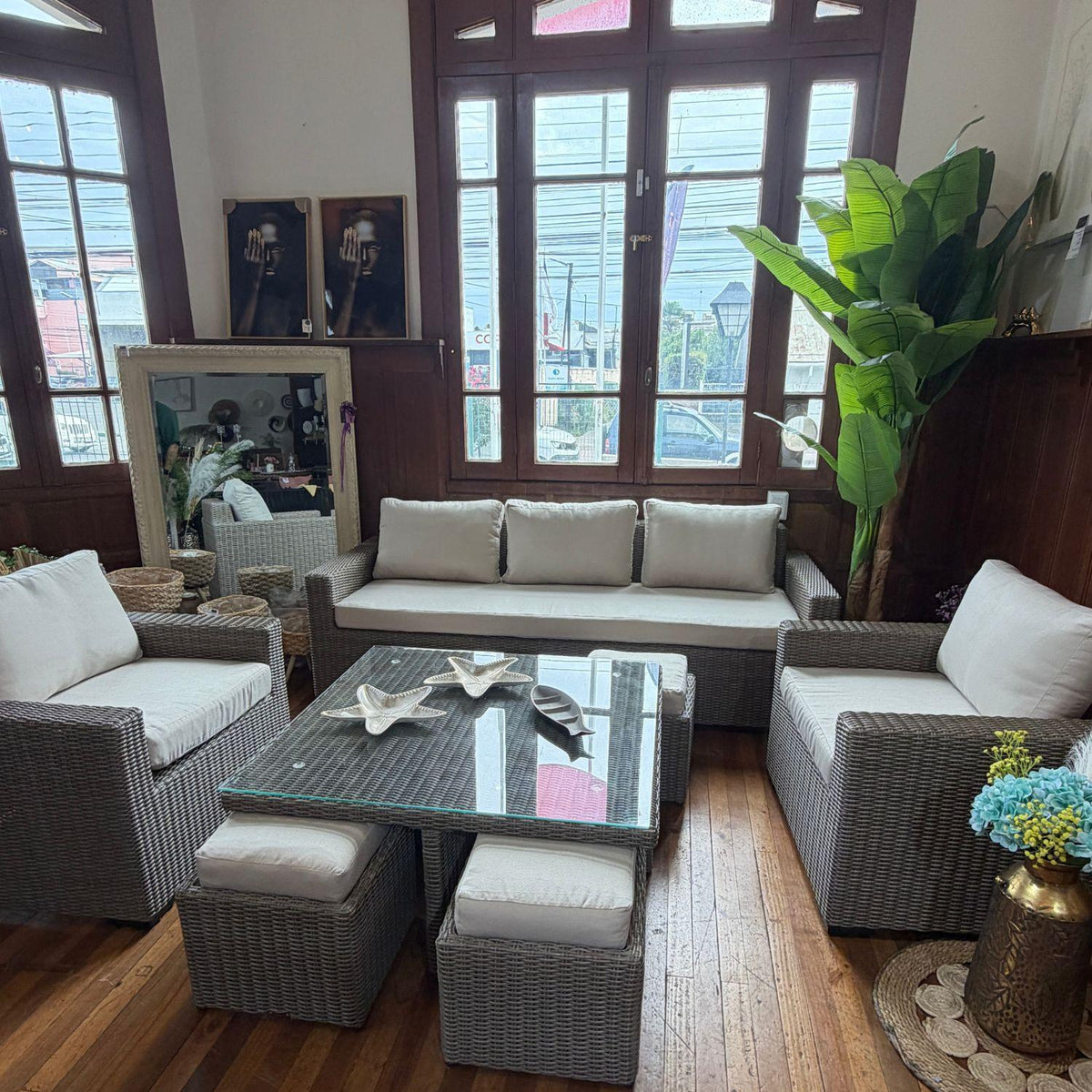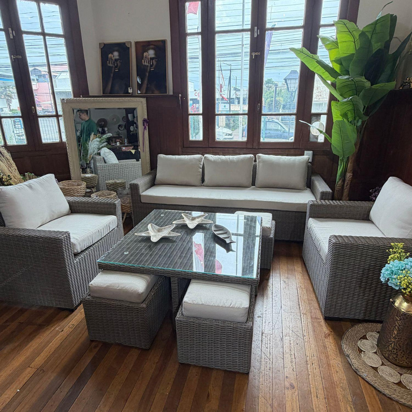 Este conjunto de terraza destaca por su sofisticado diseño poco convencional en rattán polivinílico en 1/2 caña es muy resistente a cualquier tipo de clima y su agresor es muy superior a los de fibra plana , con un estilo distintivo y elegante. Ideal para aquellos que buscan un toque de originalidad y comodidad en sus espacios al aire libre, además la mesa con puff permite que puedan vivir momentos inolvidables la familia y los amigos.