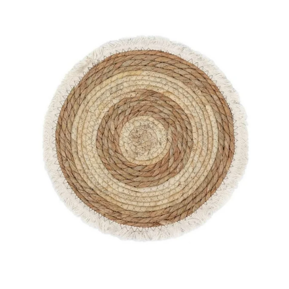 Con estos elegantes individuales de Yute, elaborados con algodón que combina durabilidad y suavidad. Este set de 4 piezas no solo añadirá un toque de estilo a su mesa, sino que también protegerá su superficie de manchas y derrames. estos individuales son fáciles de limpiar y mantener, brindando un toque de sofisticación a cualquier comida. Además, respaldamos la calidad de nuestros productos con una garantía de 3 meses, para que pueda comprar con total confianza. ¡Disfrute de la elegancia y la funcionalidad con estos individuales de Yute algodón!Posee unas medidas de: 38 cm (Diámetro)