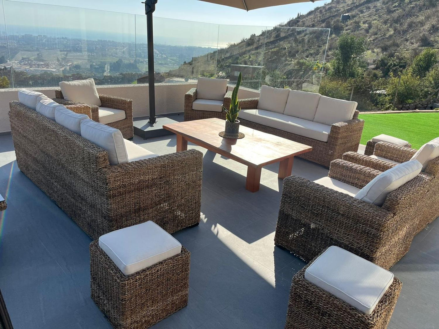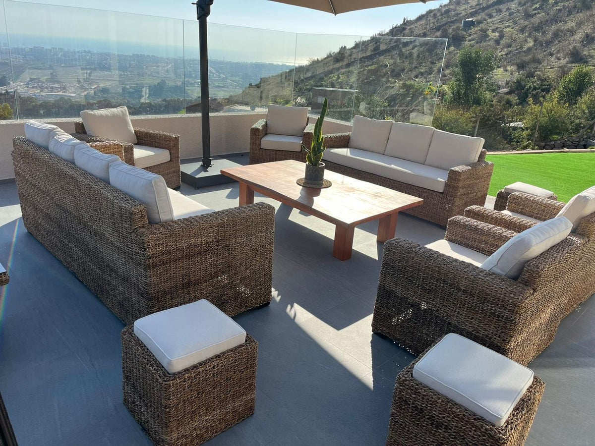 El juego de terraza Kuta Rattan Natural es un conjunto de muebles diseñados para crear un espacio cómodo y elegante en tu terraza o lugar elegido para el. Está fabricado principalmente con materiales de rattán natural, madera y fibras naturales de jacinto de agua, todos materiales conocidos por su durabilidad y aspecto atractivo y nobleza que aporta mucha calidez al hogar.