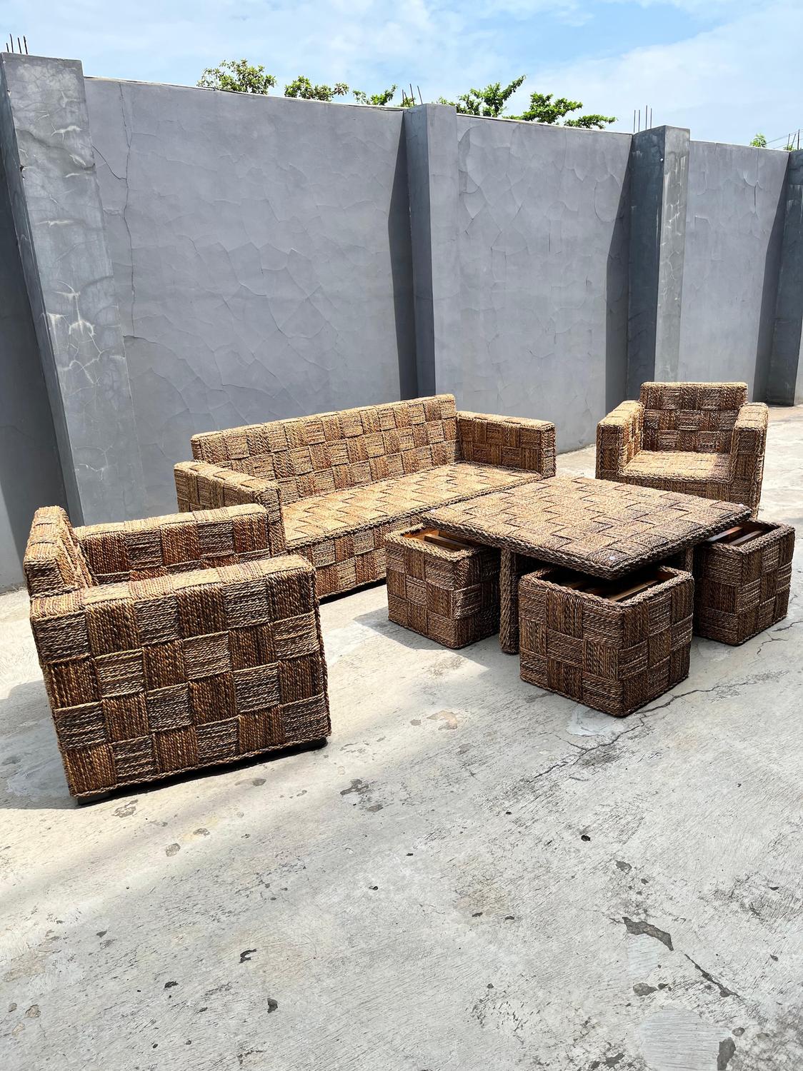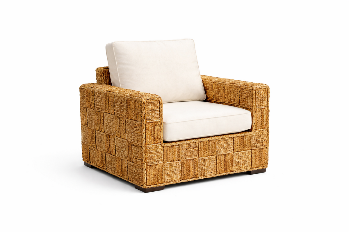 Cada pieza es tejida a mano por artesanos, permitiendo que cada mueble sea único, con vetas y tonalidades que reflejan la belleza de la naturaleza. Su diseño combina un estilo premium, cálido y atemporal, perfecto para terrazas, quinchos, livings interiores y ambientes de lujo silencioso.