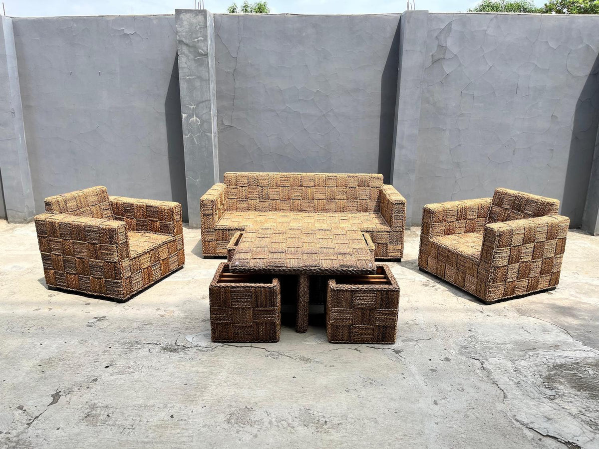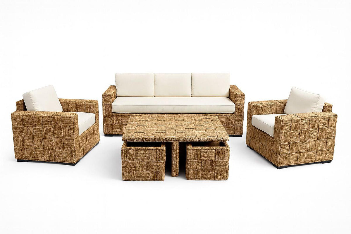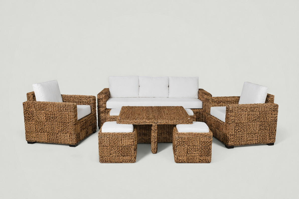El juego de terraza Kuta Rattan Natural es un conjunto de muebles diseñados para crear un espacio cómodo y elegante en tu terraza o lugar elegido para el. Está fabricado principalmente con materiales de rattán natural, madera y fibras naturales de jacinto de agua, todos materiales conocidos por su durabilidad y aspecto atractivo y nobleza que aporta mucha calidez al hogar.